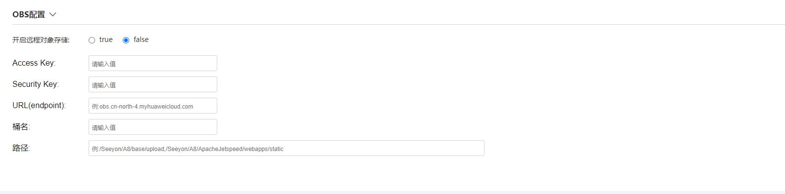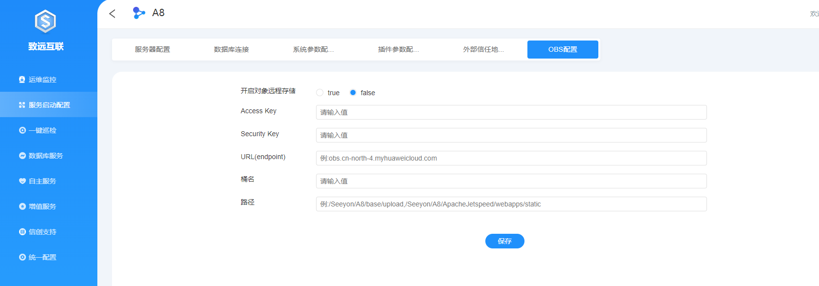 2、另外在2.2服务启动配置页面中的A8配置界面也可进行OBS配置