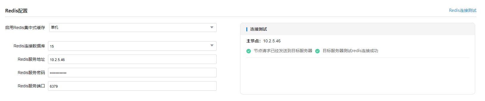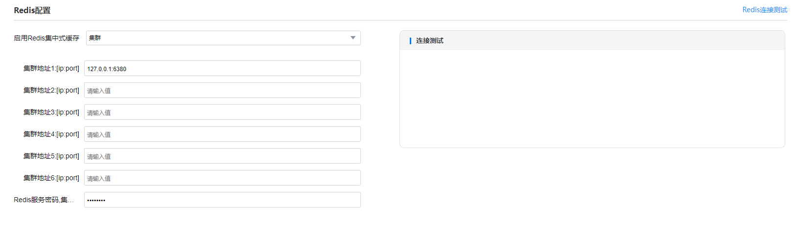 集群下redis所有节点要保证密码一致,点击连接测试,协同节点会去连接redis,若连接失败则返回失败信息