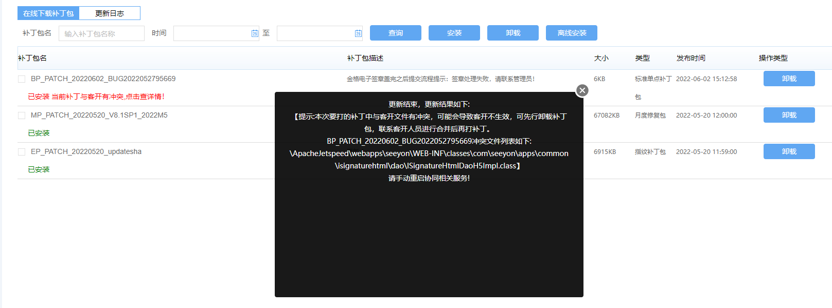 安装补丁包结束后,若提示存在冲突,则需要向客开人员反馈冲突信息,并检查客开功能是否正常。若无冲突提示,则打包正常。