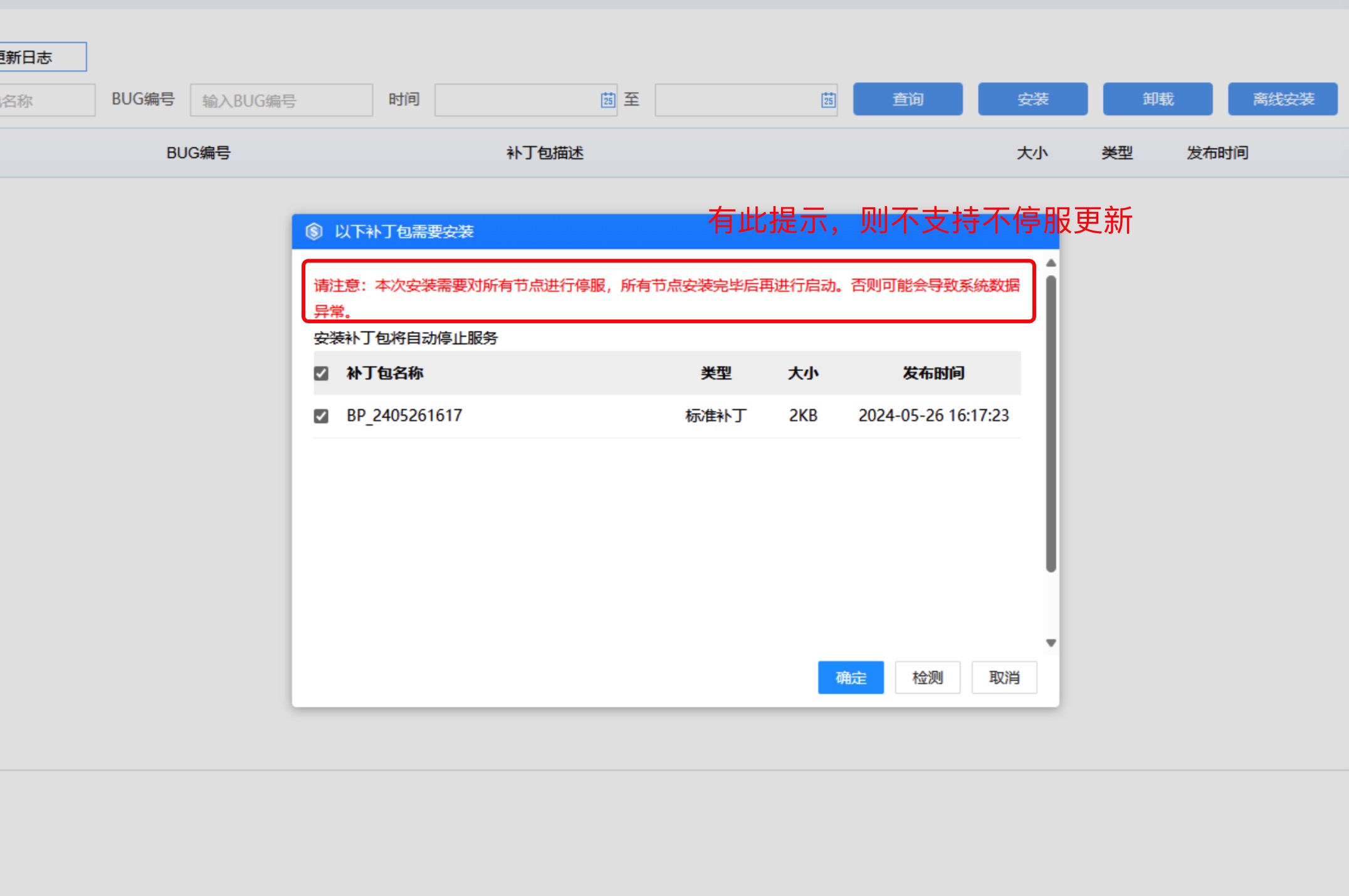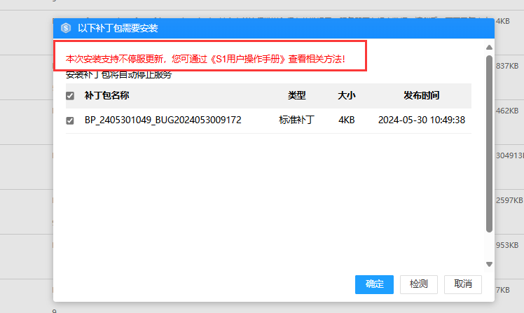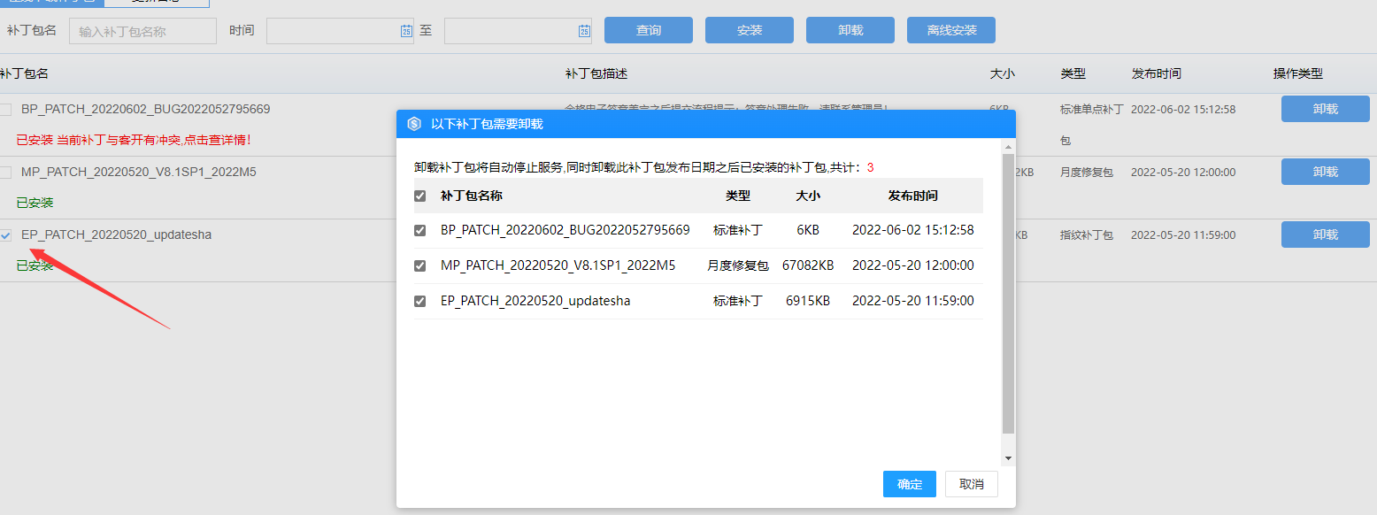 选择补丁包安装时,自动检查当前列表中的所有补丁包,若选择的补丁包发布时间前,存在其他补丁包,则会默认勾选,不可取消,然后一并安装