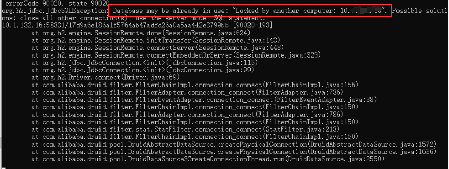 S1中内置了H2数据库,当H2数据库被打开时,都会创建一个锁定文件,以指示数据库正在使用的其他进程,若更换过服务器IP,可能会导致文件被锁定导致启动失败,错误提示如下: