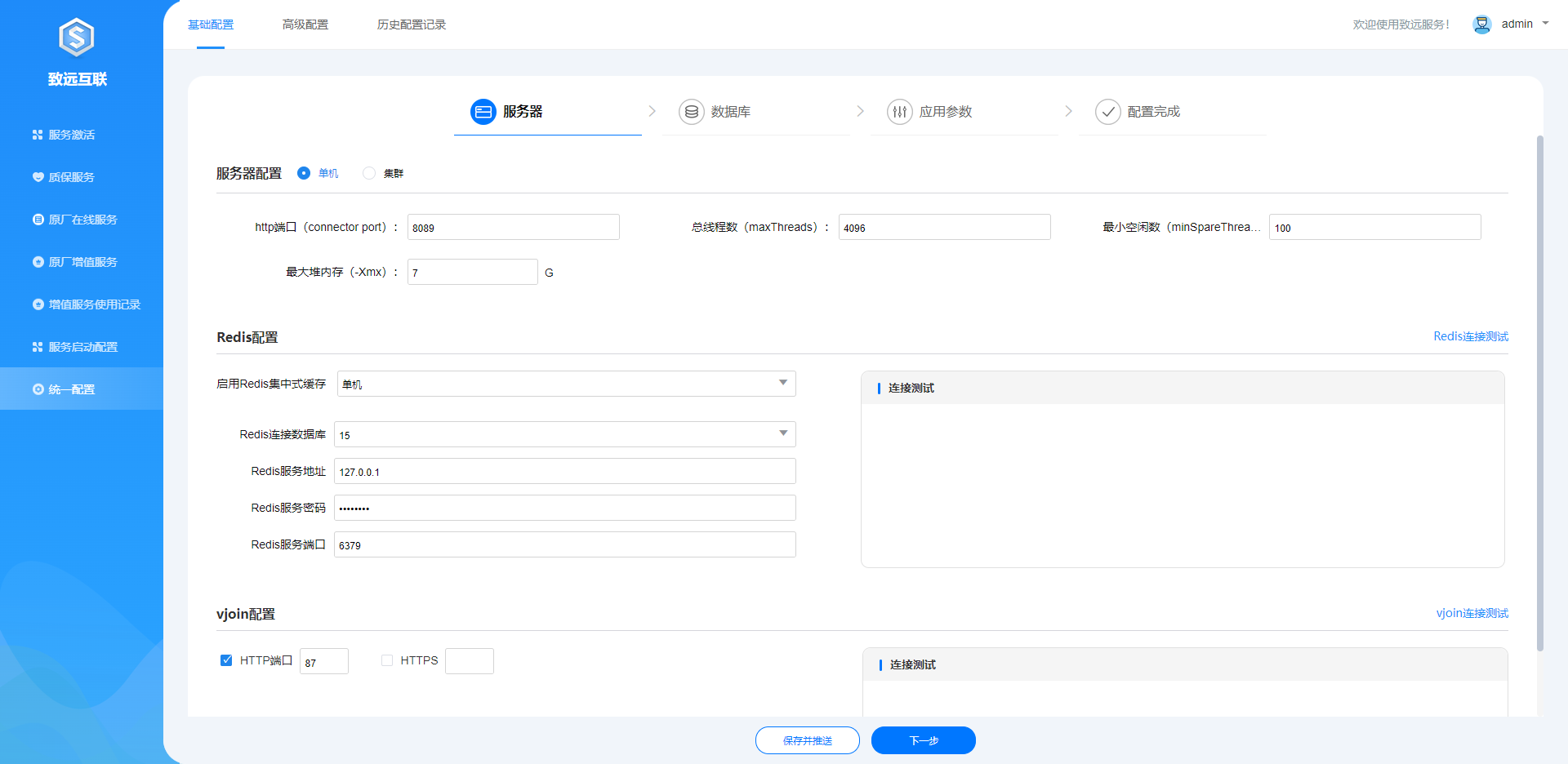 进入统一配置页面后,首页为服务器配置页面,当前页可进行协同、redis、nginx、vjoin四项服务配置