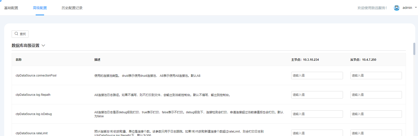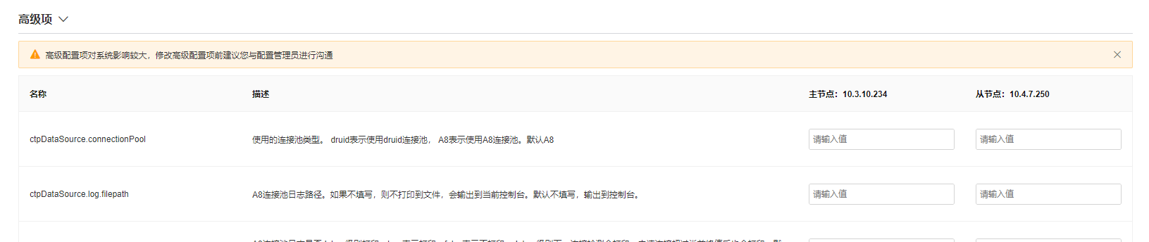 - 集群模式下,高级项配置支持多节点配置,如下图所示