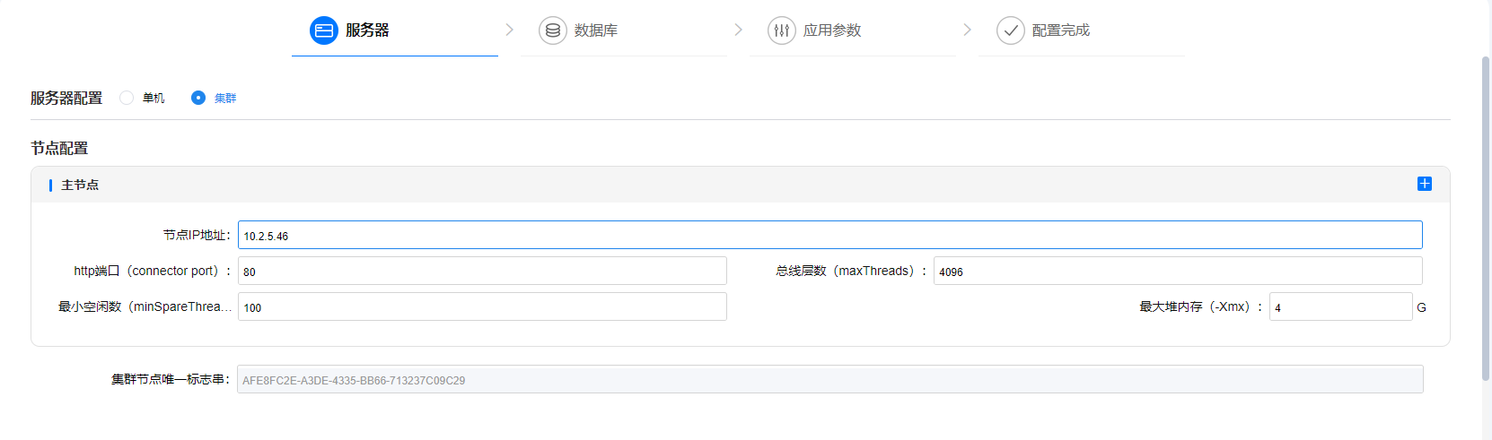 如下图所示,默认会将当前节点作为主节点,不可将主节点设置成其它服务器地址,否则配置会失效,换句话就是说,若想从单机部署切换为集群部署,则需要在主节点服务器上通过S1去配置