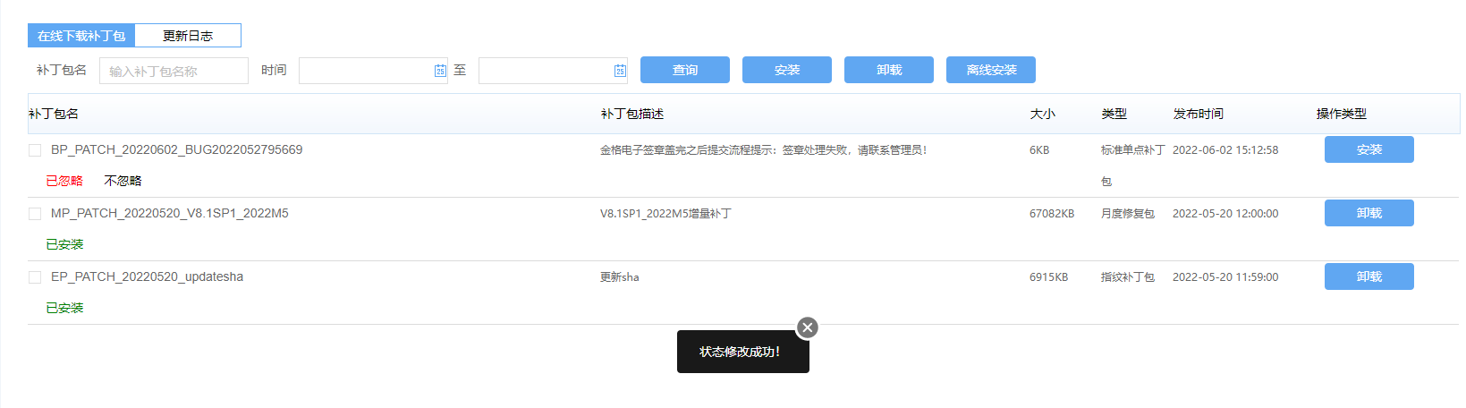 补丁包更新支持可视化的上传、下载产品标准补丁包,可视化的进行补丁包安装(自动备份程序,安装补丁包)、补丁包卸载(自动还原至打包前),并记录补丁包的操作日志。