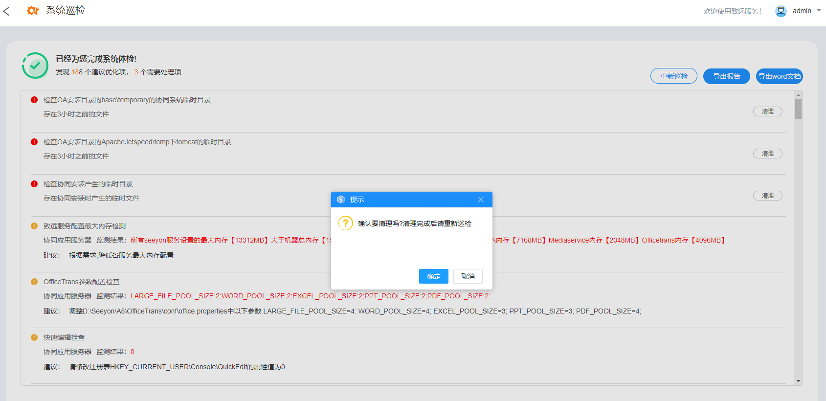 【检查结果】协同环境检查结果分成三类:错误、警告、正常。错误项必须修复否则协同不能正常访问。警告项,影响特定场景仅建议修复,不影响协同正常使用。正常项指符合环境匹配需求,无需操作。