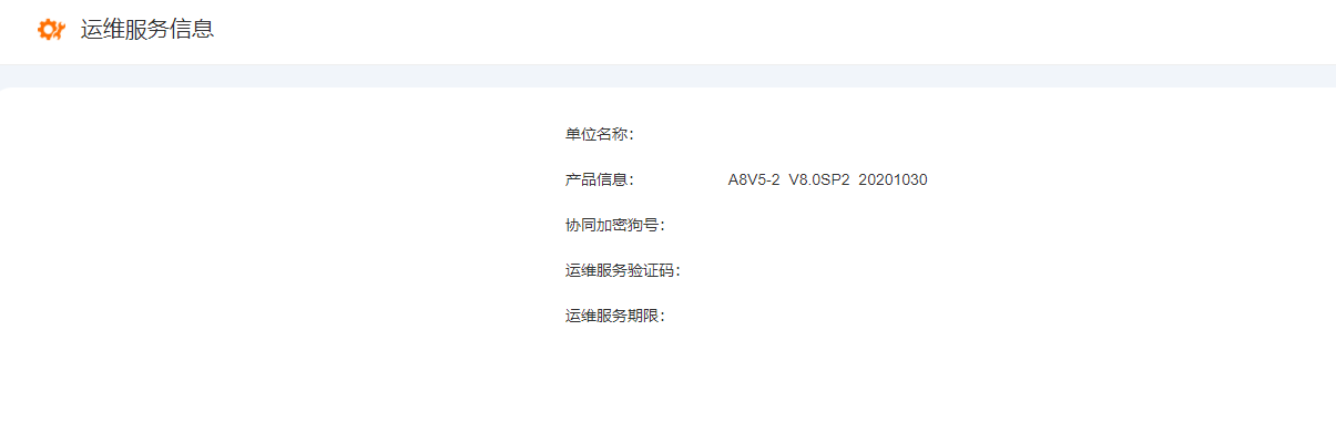 查看运维服务信息,包含单位名称,协同产品版本、加密狗号、运维服务期限、服务验证码等信息。(查看该信息的前提需要进行授权)