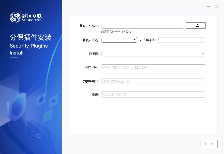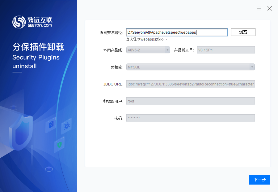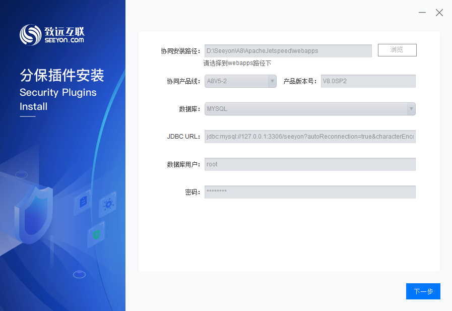 2、标准环境将工具安装到A8目录下(例:D:\Seeyon\A8\fenbaotools),只需要设置以下信息