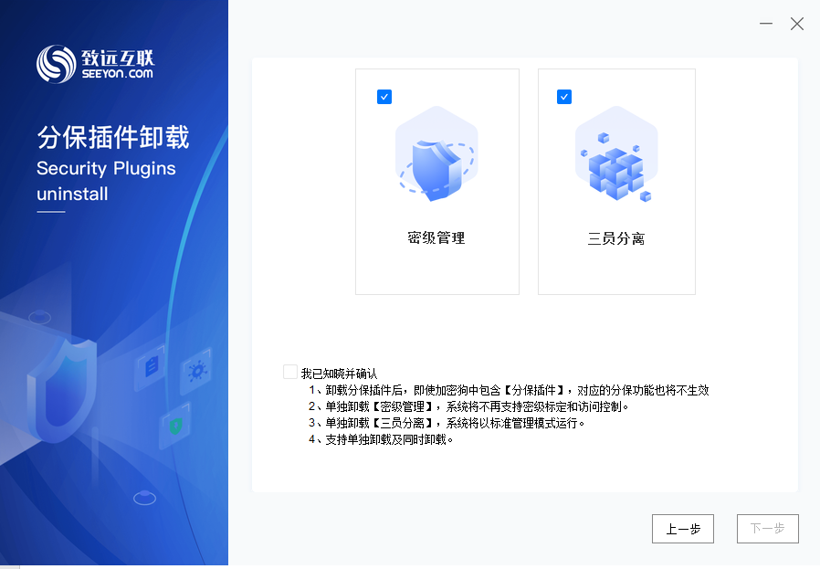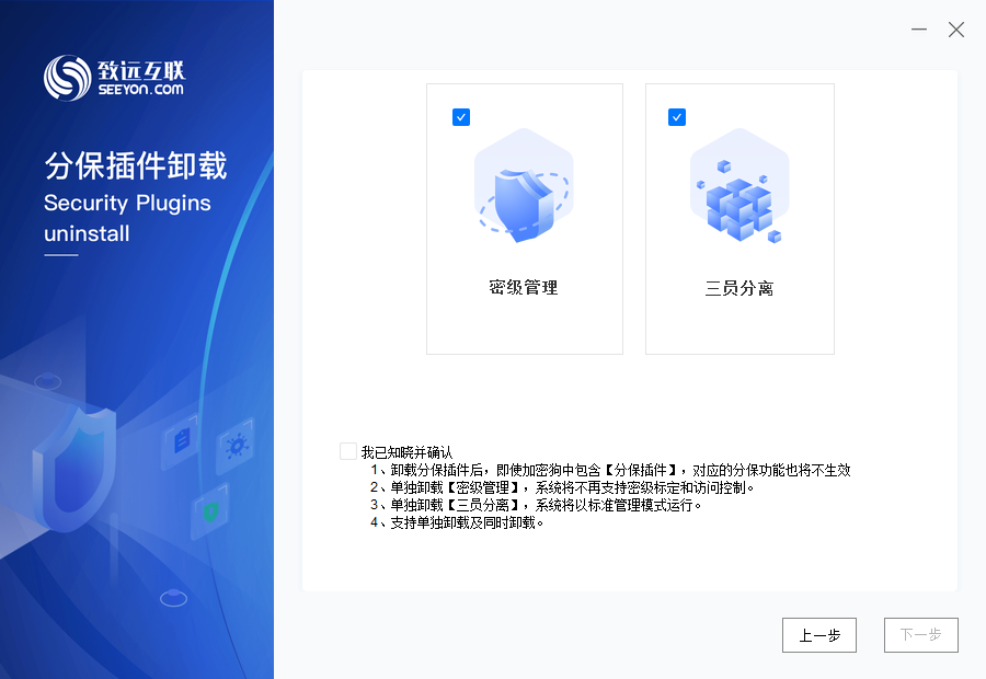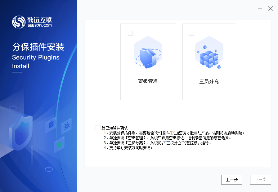 选择密级或者三员、或者两者都选。确认信息必须勾选后才允许点击下一步