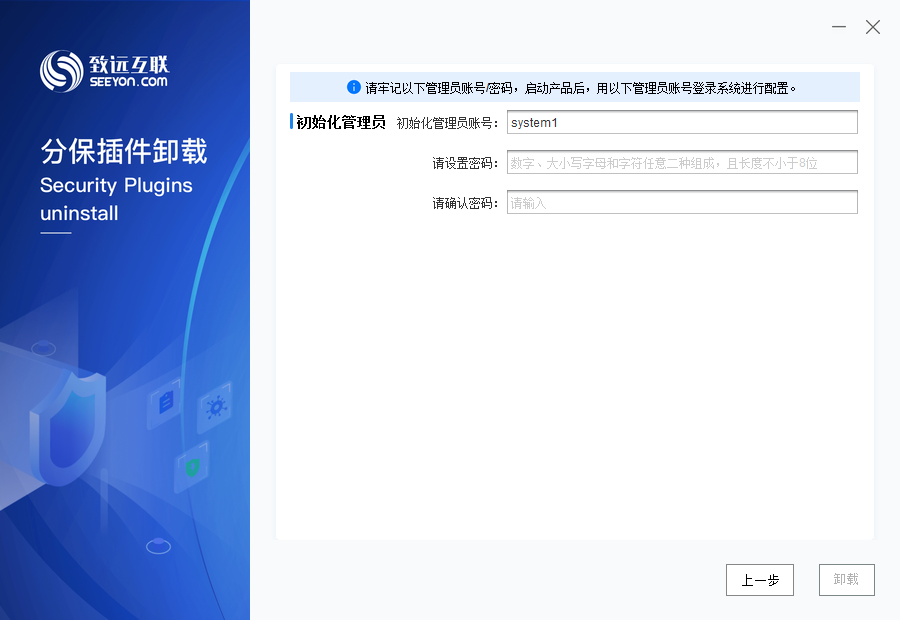 设置初始化管理员账号(若当前环境已有初始化管理员账号,则会回显。校验:账号不允许重名,不能有特殊字符、密码由数字、大小写字母和字符任意两种组成,长度不小于8位)