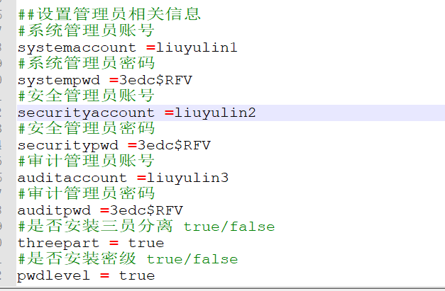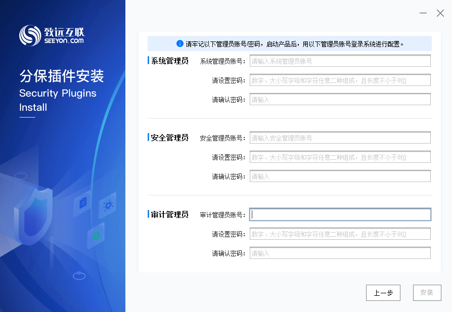 设置三员管理员账号(校验:账号不允许重名,不能有特殊字符、密码由数字、大小写字母和字符任意两种组成,长度不小于8位)