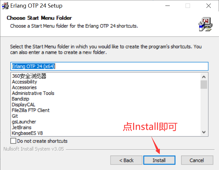在弹出的Erlang安装界面,这里可以取消勾选"Erlang Documentation",节省一点空间。