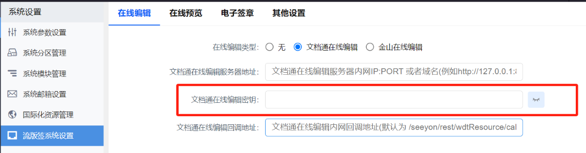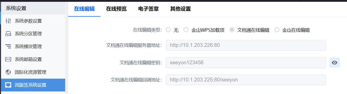 此问题,请与实施部署文档通的人一起看本手册"协同OA侧配置文档通在线编辑"章节,或本手册搜索"JWT"关键字查找解决方案。