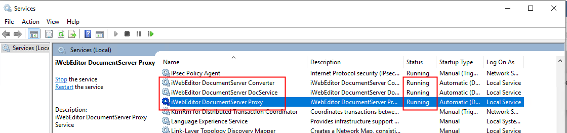 将iWebEditor DocumentServer DocService服务和iWebEditor DocumentServer Converter服务的运行用户改为当前系统用户。在服务管理器中找到两个服务,分别右键选择属性,修改用户,如下图: