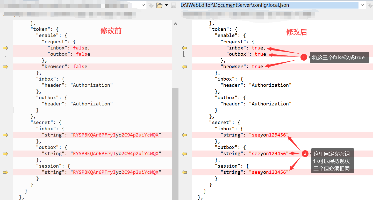 以文档通1.5.99.1升级为1.6.11.1版本为例,对比local.json文件,发现只有"secretString"这一行有差异,但是这一行我们没修改过,故可以忽略此差异。
