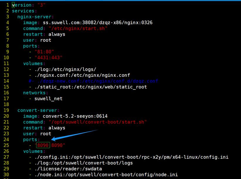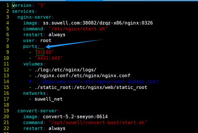 找到关于nginx服务模块需要将ports: 指定将容器内部端口映射到宿主机上的端口再加两个个https使用的端口 4431对应的是预览、8099对应的是转换