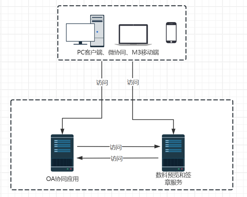 首先,画出客户端、协同OA服务器、数科服务的网络关系,以及访问域名(或IP端口)。