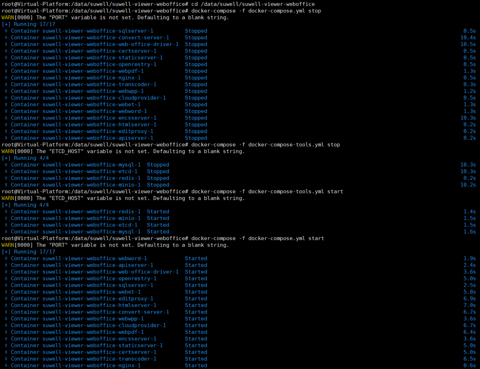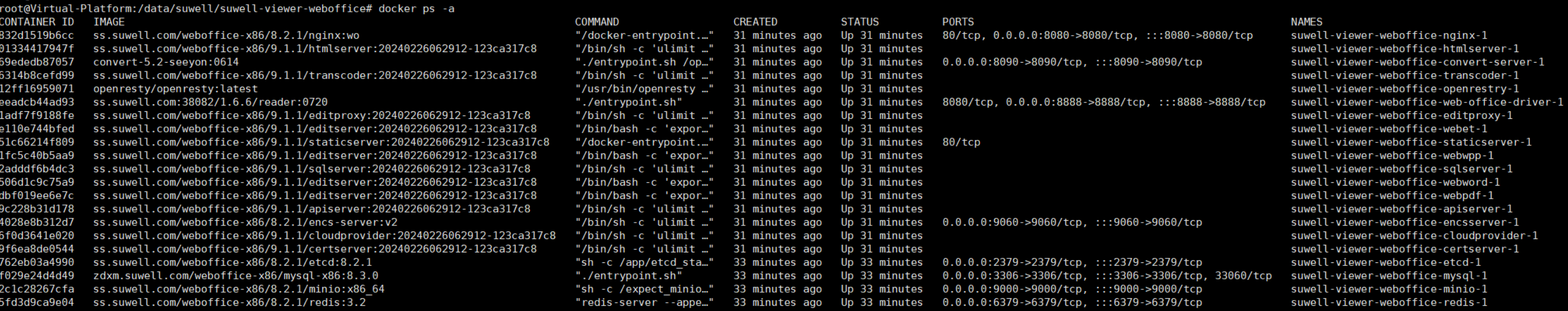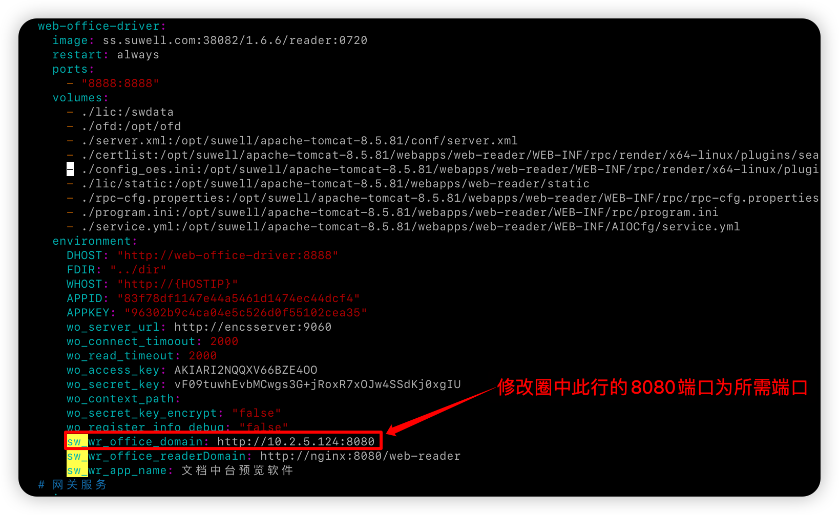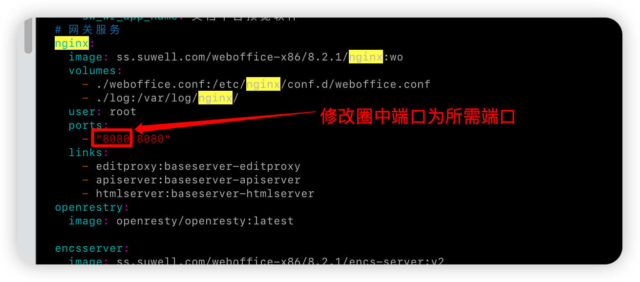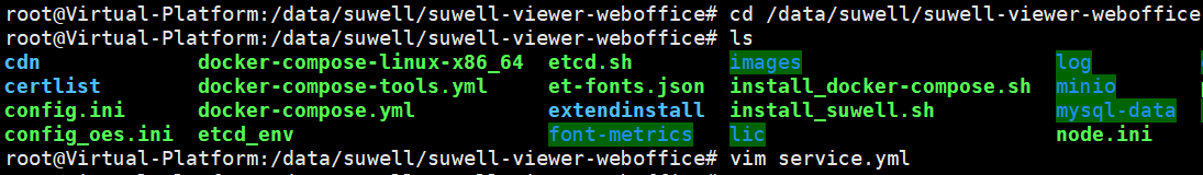 编辑docker-compose.yml配置文件,进入部署路径(按实际路径修改)如:cd /data/suwell/suwell-viewer-weboffice