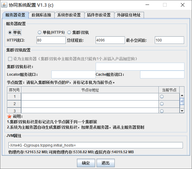 JVM属性设置,其中-Djava.rmi.server.hostname=127.0.0.1配置里的ip地址需要改成转换服务器内网ip,默认端口1097和1098,如果是分离部署需要开放端口让协同服务可以访问。
