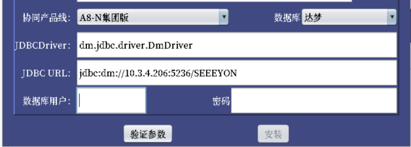 JDBC URL修改ip为需要升级的数据库ip,端口对应数据库的端口,人大金仓数据库,请修改后面的数据库名,达梦数据库需根据实际创建的实例名修改SEEYON的值(如果不确定,请参考中间件中的JDBC配置中填写的内容)