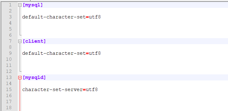 若MySQL配置文件不存在[client]、[mysql]项,请在配置文件最开始添加,如图: