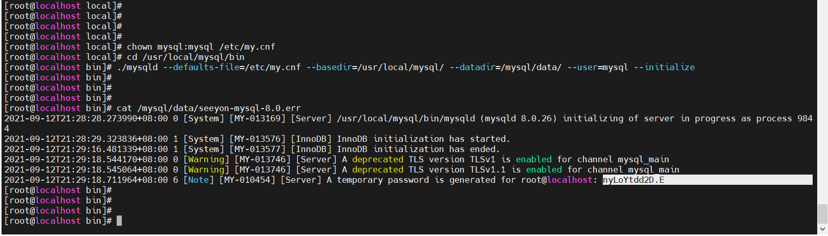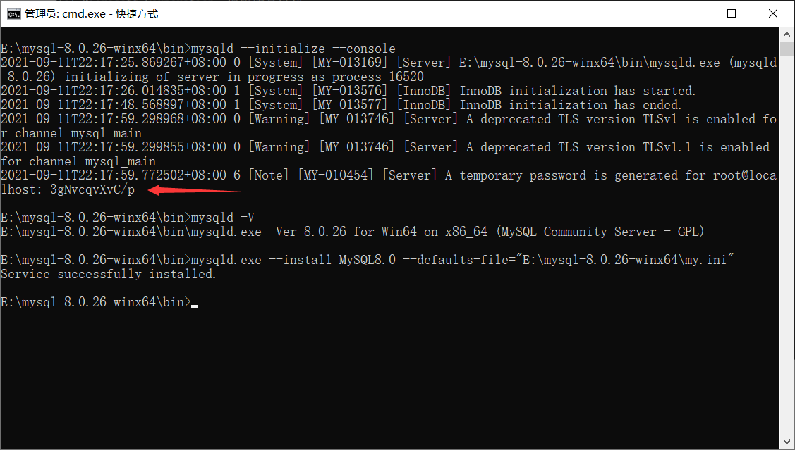 初始化数据库,执行命令mysqld --initialize --console,记住生成的随机密码