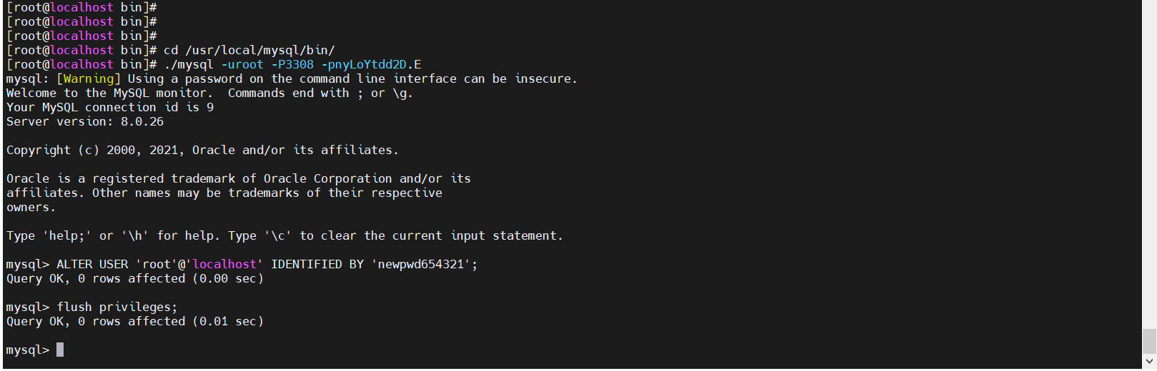 6)使用mysql命令行登录数据库修改root密码(需要初始化数据库生成的随机密码,以下举例供参考,以实际密码为准)