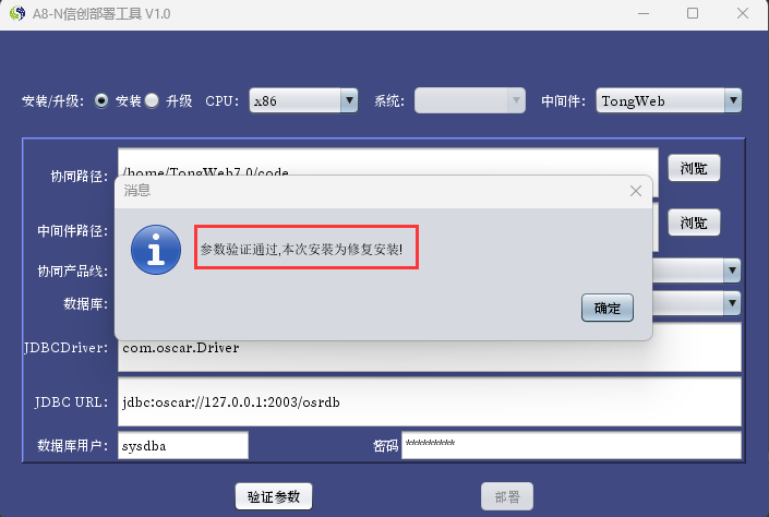 填写后结果点击验证结果,验证结果的过程中,会根据配置的数据库连接,对数据库进行查询,从而给出安装类型的提示(全新/修复),如下图: