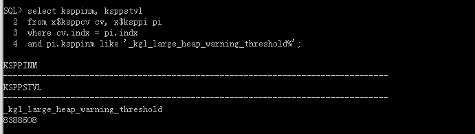 select ksppinm, ksppstvl from x$ksppcv cv, x$ksppi pi where cv.indx = pi.indx and pi.ksppinm like '_kgl_large_heap_warning_threshold%';