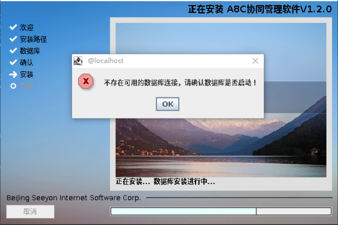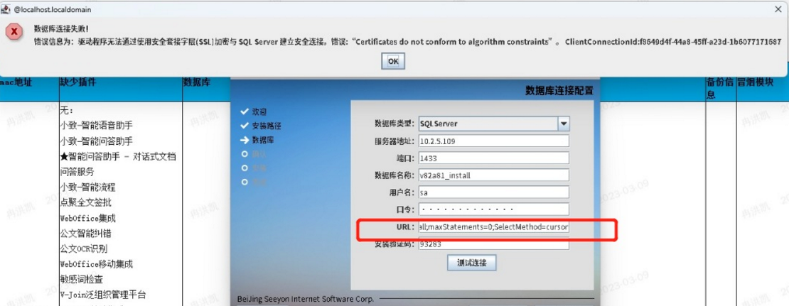 问题一、进行数据库连接测试,出现报错提示,如下图所示,从而导致协同启动失败