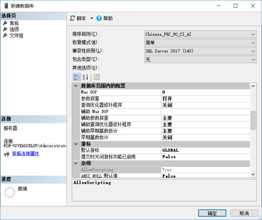 恢复模式推荐设置为简单,避免数据库日志文件增长过大增长过快的问题; 但是注意此设置导致数据库无法自动从故障恢复到最近可用时间点,可以配合sqlserver代理服务设置数据库每天定时备份,以此保证数据可从故障恢复(最近一次备份)