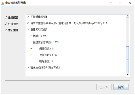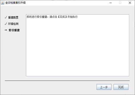 重建索引完成后,点击【完成】按钮,结束升级程序即可。然后正常进行索引服务的启动即可进行全文检索服务的检索验证和使用。