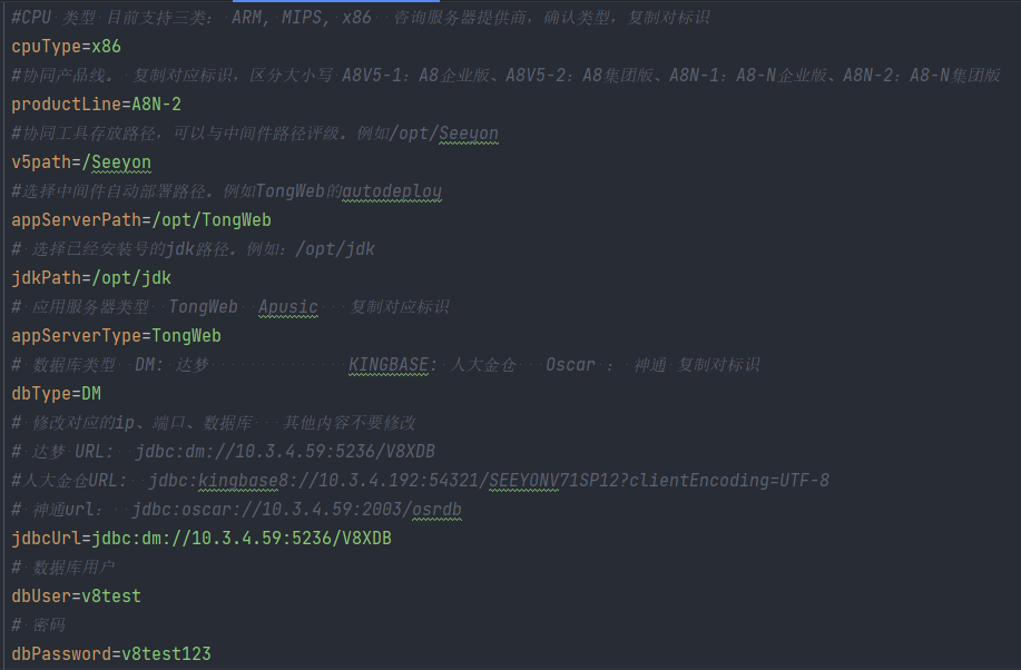 JDBC URL修改ip为需要升级的数据库ip,端口对应数据库的端口,人大金仓数据库,请修改后面的数据库名,达梦数据库需根据实际创建的实例名修改SEEYON的值(如果不确定,请参考中间件中的JDBC配置中填写的内容)