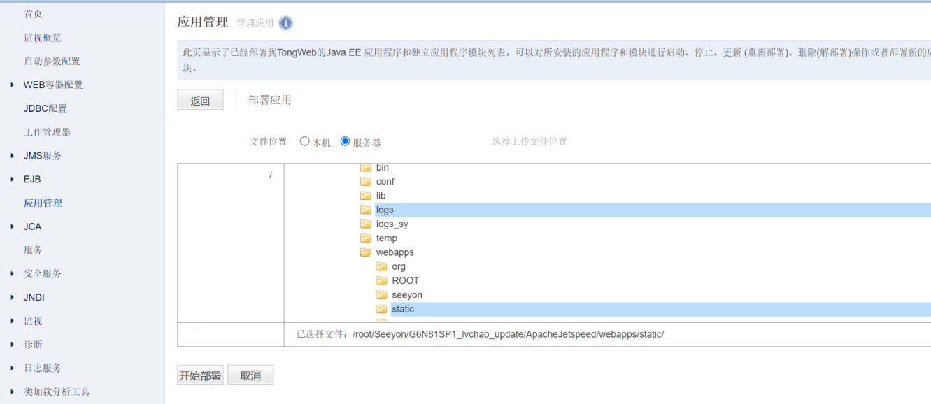 登录控制台,在seeyon-"应用管理"中进行协同应用(V5/ApacheJetspeed/webapps/static)应用部署。