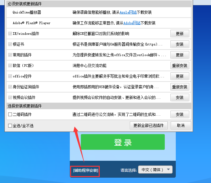 点击登录页"辅助程序安装",在弹出窗中,更新IE/windows插件、Office控件、常用的插件等辅助程序,如下图: