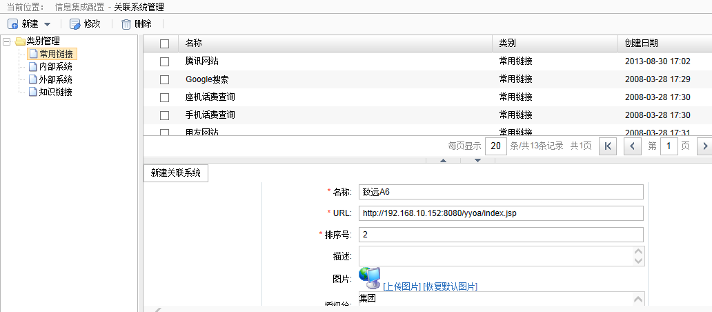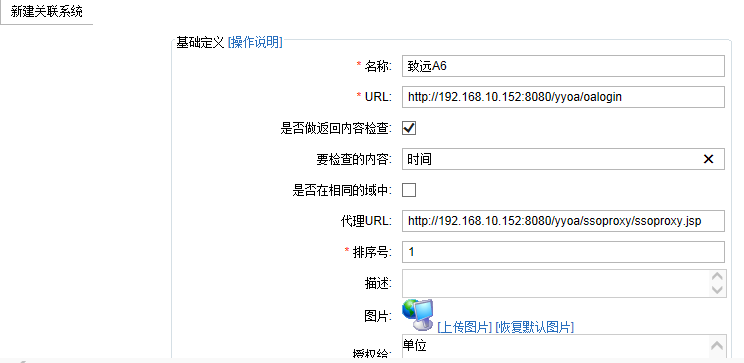 系统管理员登录V5系统后台,进入信息集成配置 - 关联系统管理页面,在常用链接下--新建关联系统,填写名称、A6的url访问地址、授权给相应人员。