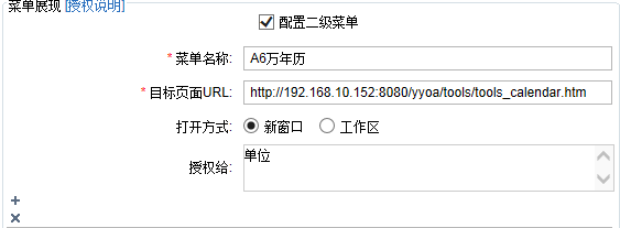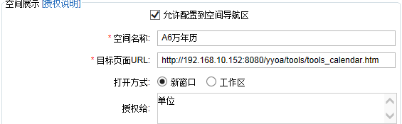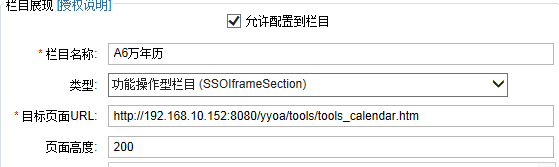 (**注意:**由于检查内容和目标页是一一对应关系,当前版本中一个关联系统仅支持一个相同的目标页(即为:如果菜单配置的是A6万年历页面,那么栏目、空间导航的目标页必须和菜单的目标页一致)。后续的版本中会开放支持一个关联系统可配置多个不同的目标页,就可以菜单、栏目、导航配置为不同的被集成目标页面,当前如果需要使用被集成系统(A6)的多个目标页,那么需要建立多个关联系统,每个关联系统单独指定自己的目标页面。)