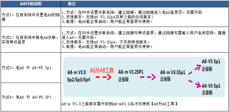如上所述,支持A6-m V3.0Sp2/Sp3/Sp4 通过升迁工具升至A8-m V3.20SP1,再升级至A8-m V3.50SP1,最后升级至最新版本。