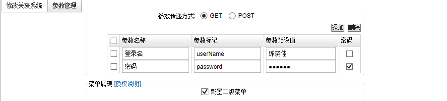 高级 - -配置参数编码以及登录参数,如下,A6的集成建议使用GBK编码,如果使用utf-8可能出现界面显示乱码,参数标记必须为userName、password,参数预设值为A6系统中某人员的登录名账号。