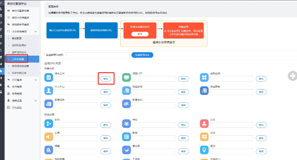 登录OA后台,打开《工作台设置》页面,复制待办工作应用地址