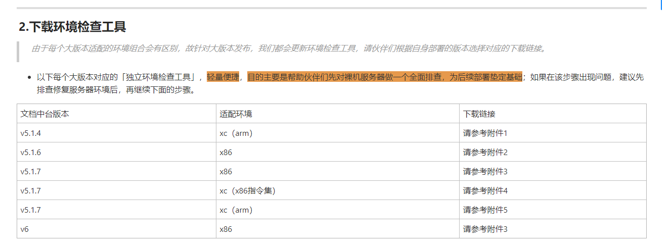 此检查为部署前环境准备阶段的基础检查,目的是快速判断同种类型服务器基础环境是否满足部署要求,完成该阶段检查后,满足条件则可以进行部署操作。