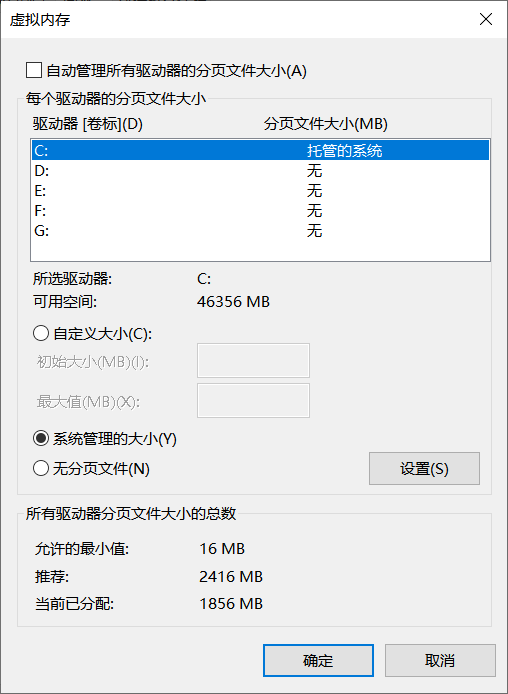 至少有一个分区上分页文件大小设置为系统管理的大小,该分区可用磁盘空间需要大于物理内存的3倍