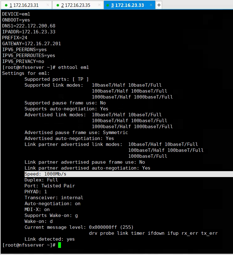 Linux服务器,命令举例:ethtool em1,查询em1网口基本设置,千兆速率