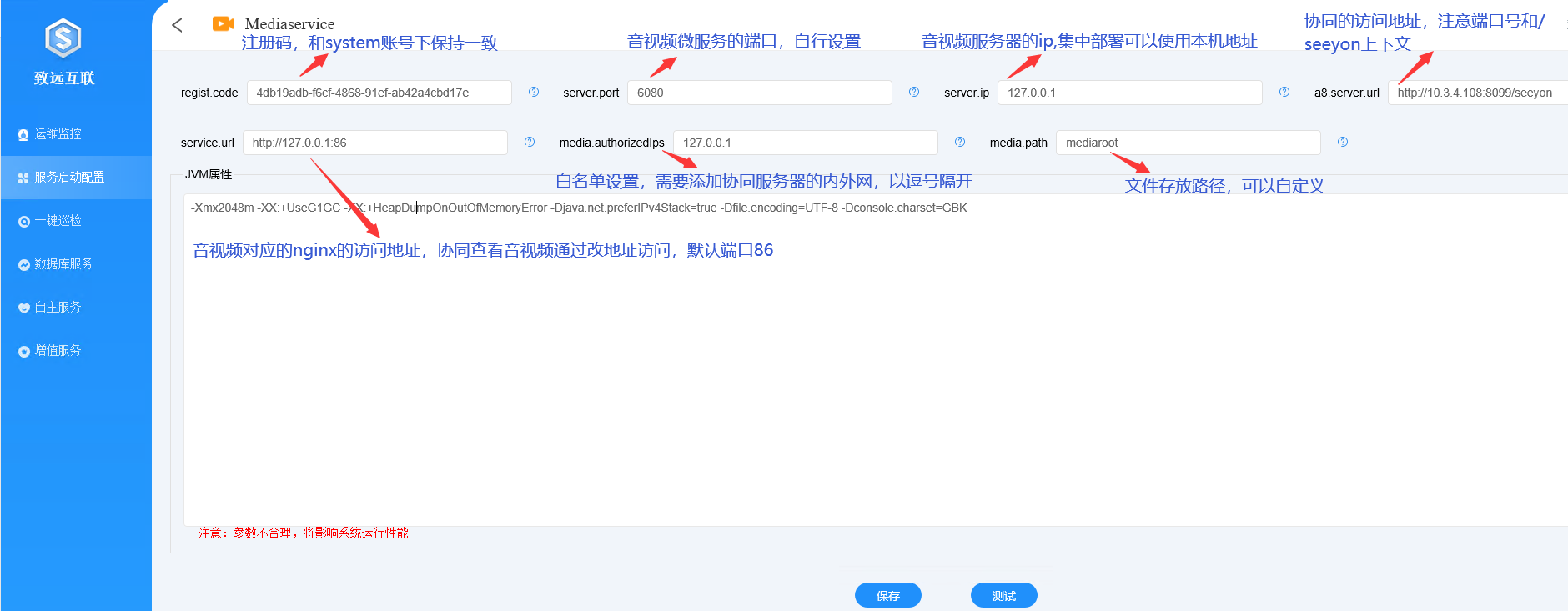 media.authorizedIps:音视频服务信任的ip地址,填写协同服务的ip地址,多个地址逗号隔开,127.0.0.1勿删。