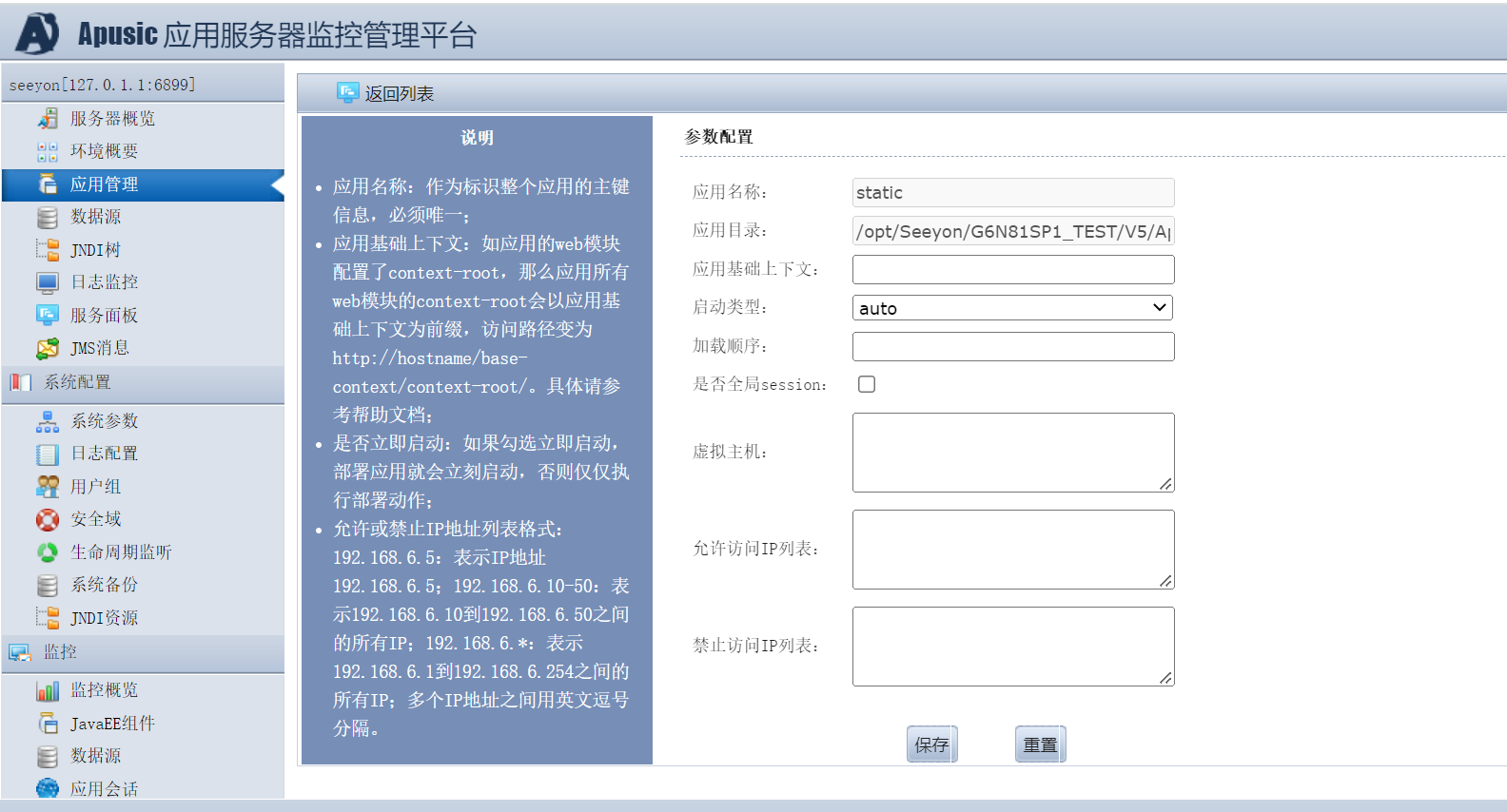 登录控制台,在seeyon-"应用管理"中进行协同应用(V5/ApacheJetspeed/webapps/static)应用部署。