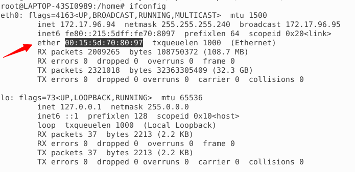 首先获取信创服务器的mac信息,通过ifconfig查看服务器网卡信息,多网卡下任选一个,如下图ether旁边那串标黑的内容就是mac,将其复制记录好。