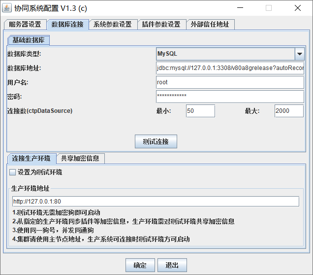 fk.db.url可以参考协同系统配置工具,数据库连接中的数据库地址格式,修改ip端口数据库名称信息后手工录入。注意,该处数据库地址为分库地址。