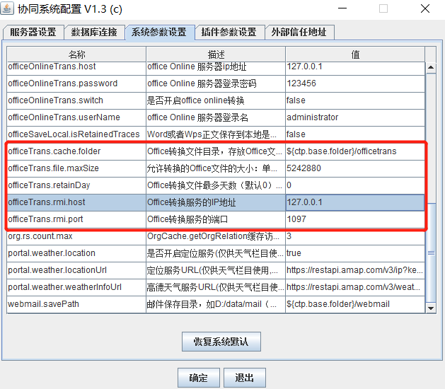 - 首先需要开启OFD后台转版插件,将【wpstrans.enable 是否启用OFD后台转版插件】的值改为true,默认的false;