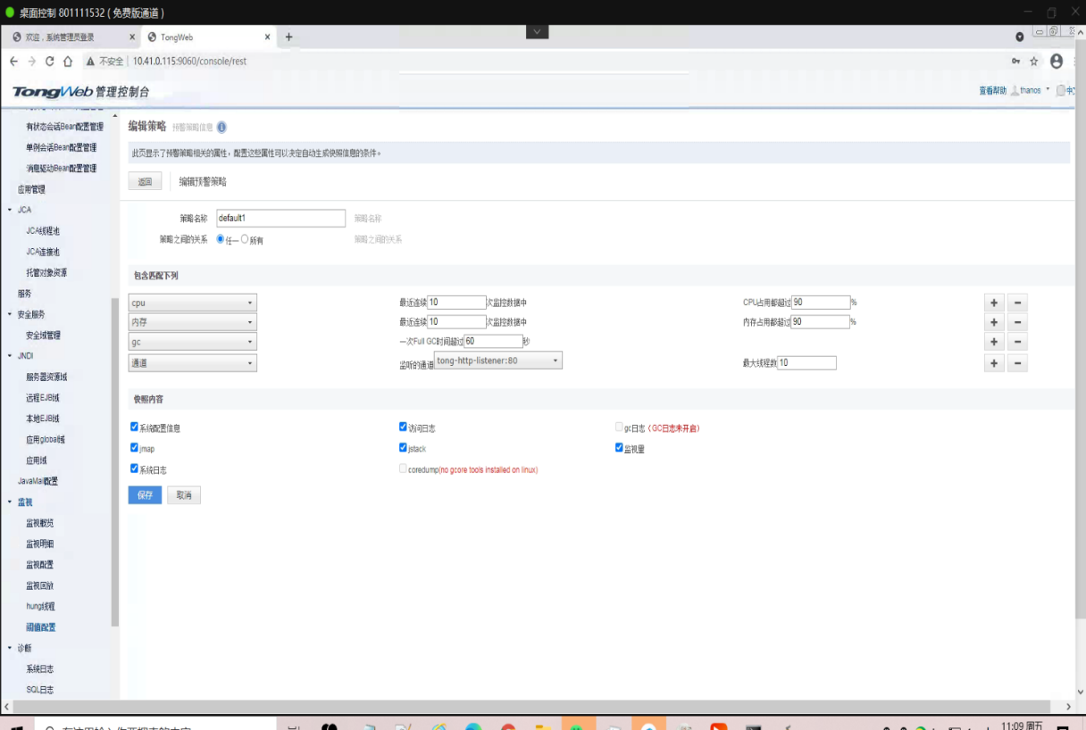 TongWeb7.0.4.1 --> 管理控制台 --> 监视 --> 阈值配置 --> default1 --> 勾选了快照jmap会在触发时执行fullgc导致卡顿现象。