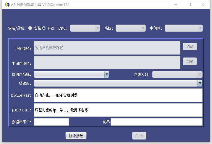 特别注意:此部署过程,会将产品标识文件放置到OA目录、版本初始化sql导入数据库、以及自动实现中间部分配置(标注自动的部分,若数据库类型为其他,部署完整后,需要手动初始化数据库,并手动部署JDBC数据源),后续无需再人工进行相应操作,由于工具会自动配置中间件,所以使用工具前,需要先根据手册创建和节点实例,并启动一次实例后,再使用工具部署。